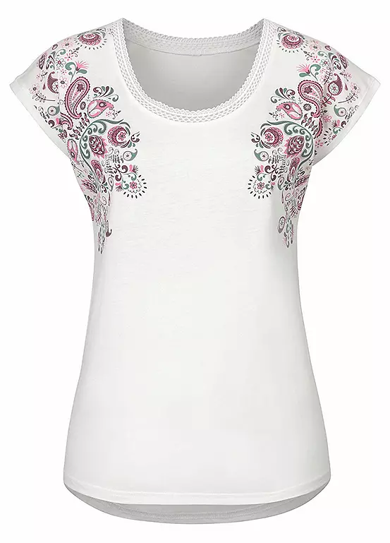 Glamorous but comfortable t-shirt, with embroidery details and lace at the neckline. Finished with stylish, overcut shoulders for a great look.
