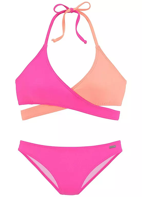 Trendy triangle bikini in a fashionable wrap around design with a colour block style. Finished with removable cups and straps to tie at the neck. Finished with back closure and matching briefs with side lacing. Removable soft cups. Briefs to tie at the side. Recycled polyamide.