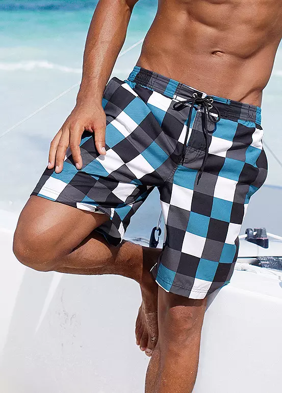 Super cool swimming shorts featuring an awesome bold checked print. Featuring an elastic waistband with a drawstring and two front pockets. A stylish choice for the beach or lounging by the pool.