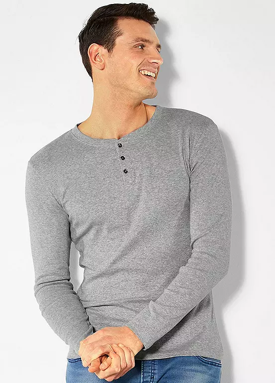 A long sleeve cotton Henley top by H.I.S in comfortable fine rib fabric with an elaborate button placket.