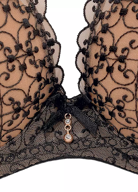 Stylish padded bra with beautiful embroidery lace in a modern look and slightly transparent mesh material. Features adjustable straps and back closure. With beautiful embroidery lace in a modern look. Slightly transparent mesh material on the sides. Small glitter accessory in the centre front. With beautiful embroidery lace in a modern look. Slightly transparent mesh material on the sides.