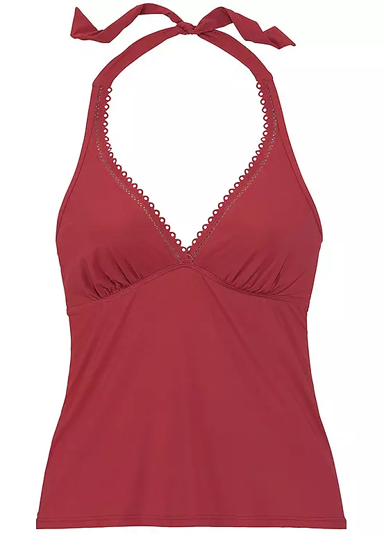 The underwired tankini top from s.Oliver can be worn as a beach top on the beach or as a top with shorts or a skirt. In any case, it cuts a great figure, because the cups can be padded with inserts and the neck holder to tie regulates the fit. In addition, the fit is cut playfully and the soft microfibre quality is airy and light. A delightful design element and unique feature of this halter top is the lace along the V-neckline. Hand wash. Outer material: 84% Polyamide, 16% Elastane. Lining: 92% Polyester, 8% Elastane.