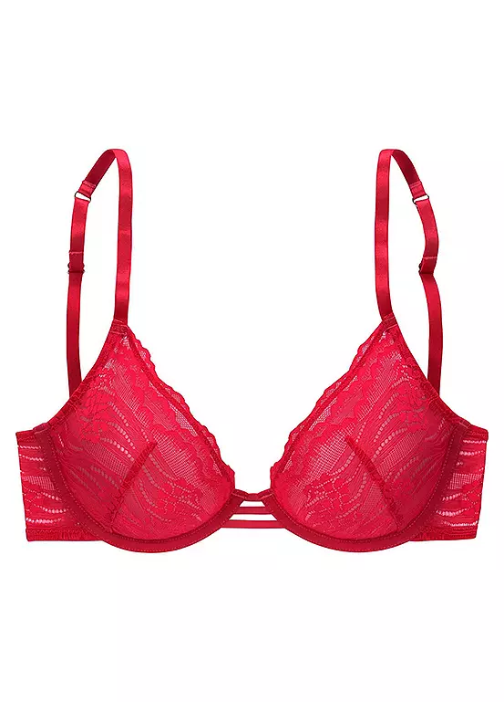 Feel glamorous in this feminine underwired bra with a fine ribbon look in the centre front. The cups are made of subtly transparent floral lace and have individually adjustable straps and back closure. This is the perfect bra for those special occasions! Shop now! Feminine underwired bra with a fine ribbon look in the centre front. Cups made of subtly transparent, floral lace.