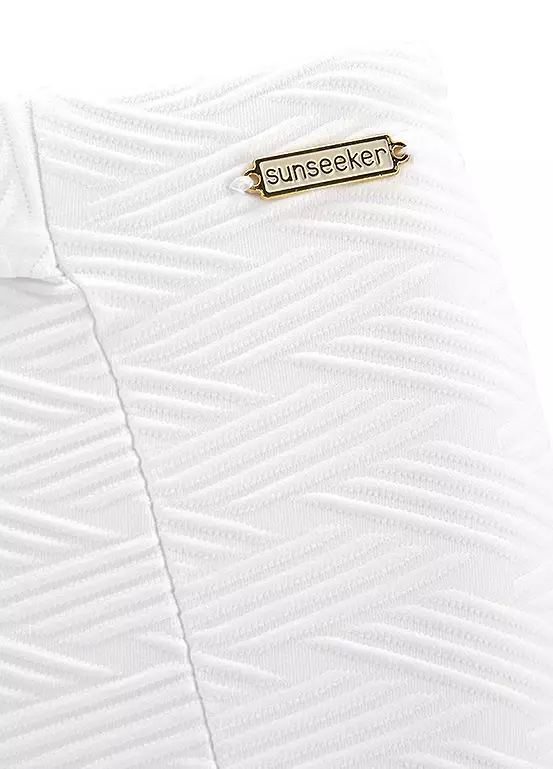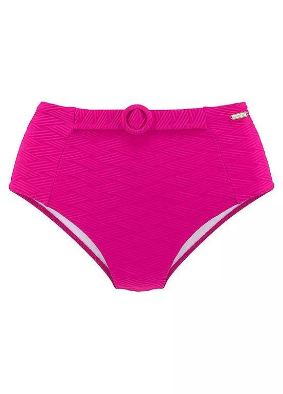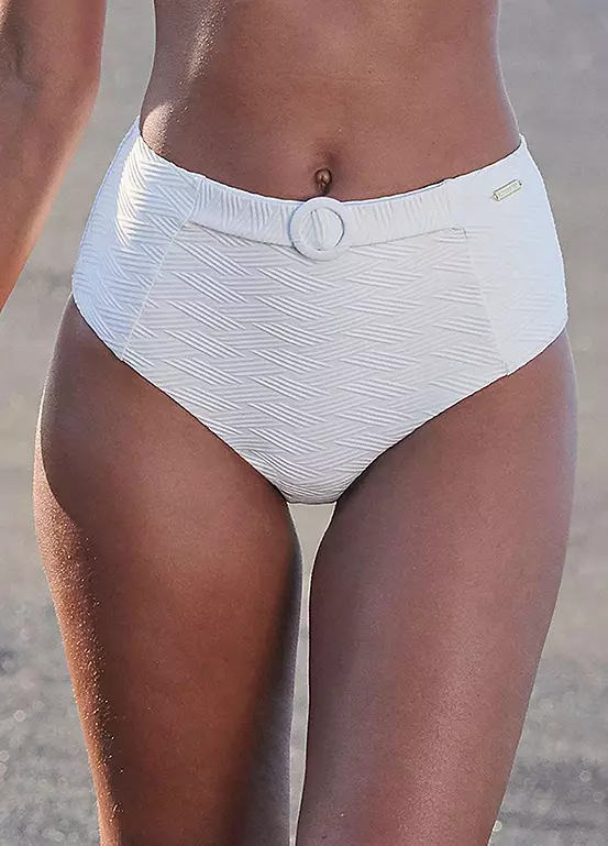 Check out the structured bikini bottoms in a higher cut and finished with a buckled belt detail. With a decorative belt. Cut higher.