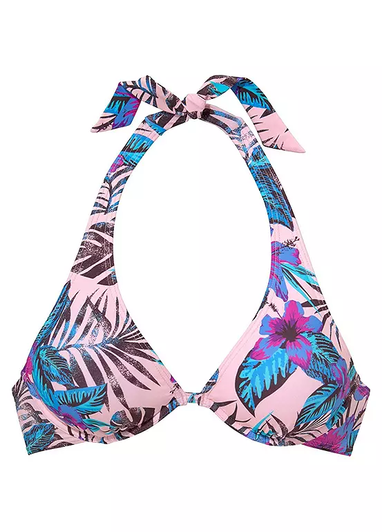 Tropical underwired bikini top with removable cups and straps that tie at the back of the neck.