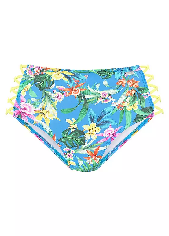 Fashionable high-waist bikini bottoms in a trendy tropical print. Styled with crossed straps on the sides. Printed – each piece is unique. Soft microfibre with recycled polyamide.