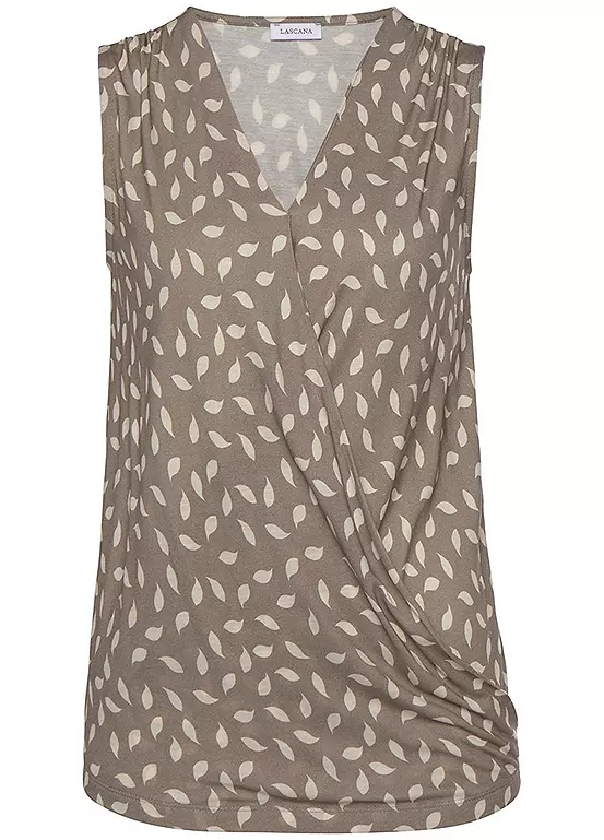 Charming vest top with an all-over print by Vivance. With a deep V-neckline in a cache-coeur style. Gathered details at hem and shoulder. Deep V-neckline. Overlapping front part fixed at the neckline.