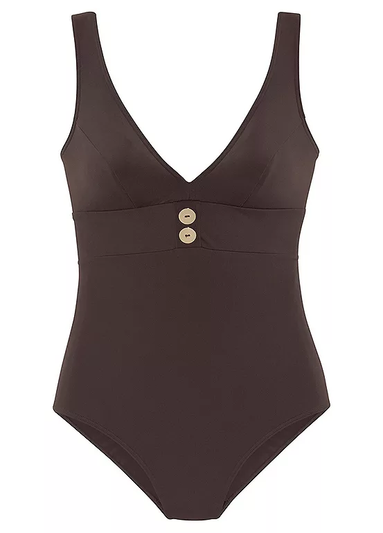 Swimsuit with integrated soft cups that form a beautiful décolleté and a round back neckline. Designed with small buttons below the chest. The quick-drying material ensures great comfort.