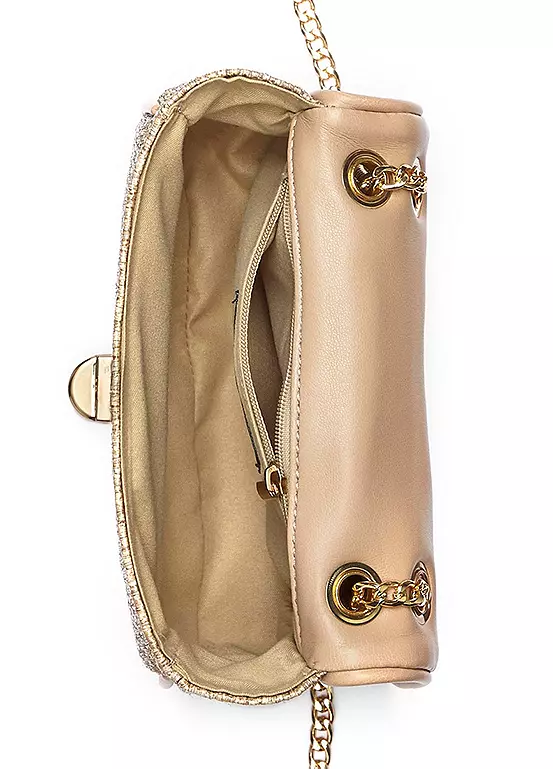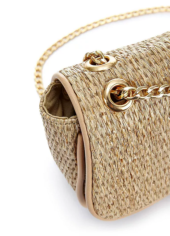 A holiday handbag with a stylish shoulder strap featuring an elegant chain handle and a twist lock with a metallic look. While the raffia look gives your outfits a casual holiday touch, the zip pocket on the inside is perfect for extra storage space. Twist lock. Perfect for a beach party. Peta approved vegan – free of animal components.