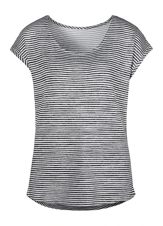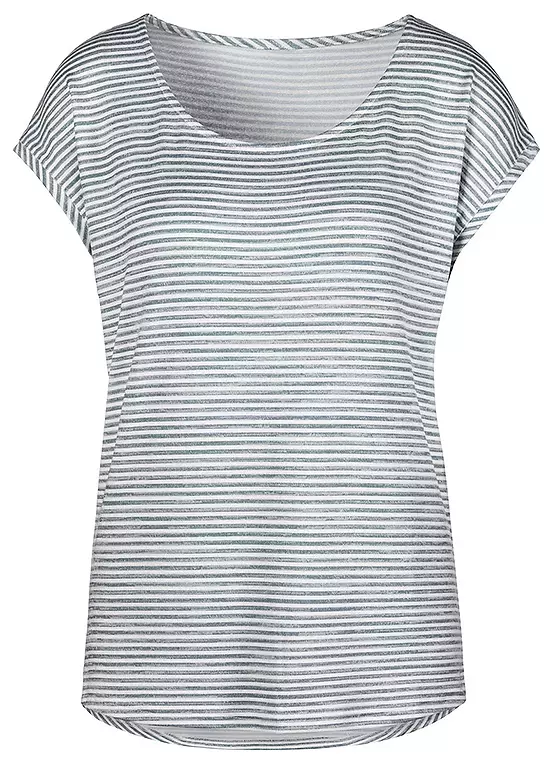 Light knit t-shirt in a striped design with short sleeves, curved hem at back and straight hem at the front. Cap sleeves. Warm viscose blend.
